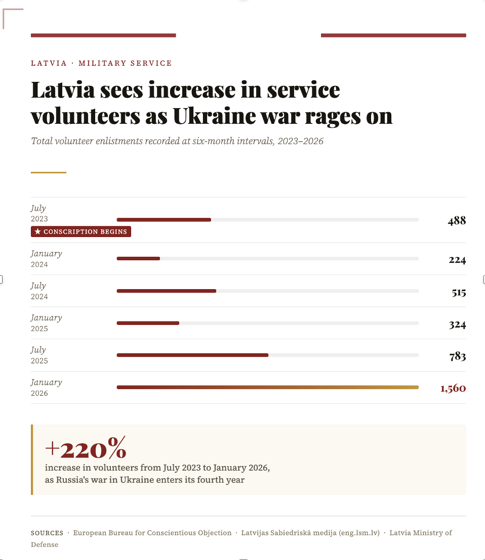 Volunteerism in the military has grown 220% as large numbers of Latvians step forward to serve under the conscription mandate that began in 2023.